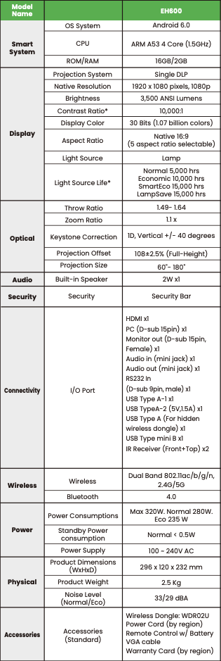 BenQ EH600 3500-Lumen Full HD Smart DLP Proyector