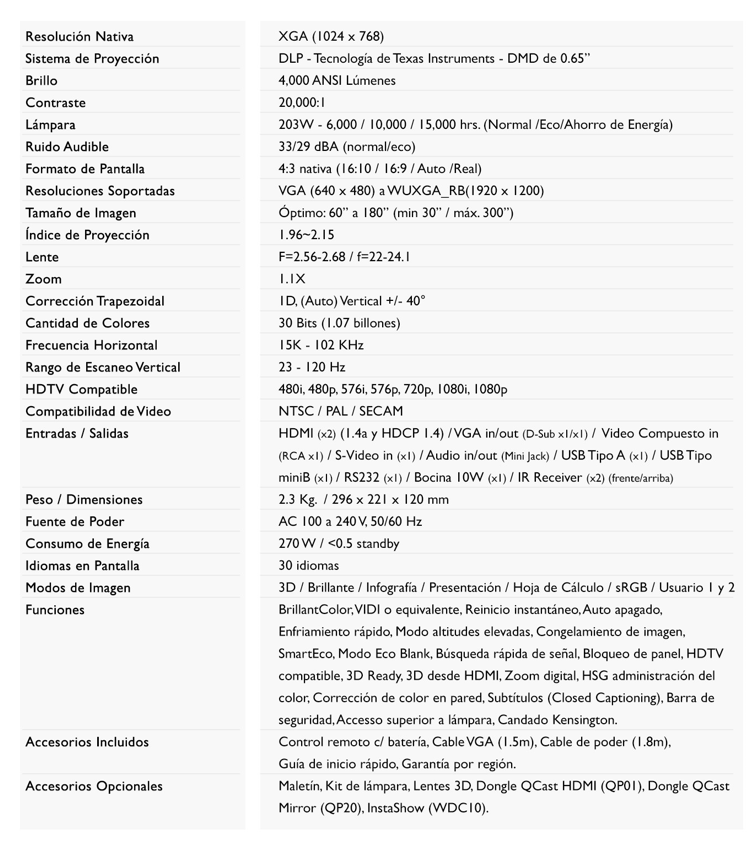 - 4000 Lúmenes, 20000:1 de Contraste: Imágenes de alto brillo y gran contraste incluso en salas de reuniones bien iluminadas.