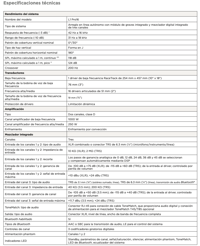 Equilibrio entre potencia y portabilidad, el Line Array portátil L1 Pro16 es un sistema aerodinámico con alta salida y rango ampliado de bajas frecuencias. Con un line array articulado en forma de J de 16 transductores, el L1 Pro16 ofrece una cobertura sonora horizontal de 180 grados, ideal para clubes, bares y otros locales de tamaño pequeño o mediano. Un subwoofer integrado con un transductor RaceTrack proporciona graves potentes sin volumen; un mezclador multicanal integrado ofrece ecualizador, reverberación y alimentación fantasma, además de Bluetooth® y acceso a la biblioteca completa de preajustes ToneMatch ; y la intuitiva aplicación Bose Music, antes conocida como aplicación L1 Mix, pone el control inalámbrico en sus manos desde su smartphone. Para DJ, cantautores y conjuntos pequeños, el L1 Pro16 le ofrece un ancho de banda ampliado y una claridad suprema: la potencia para sonar lo mejor posible y simplemente actuar.