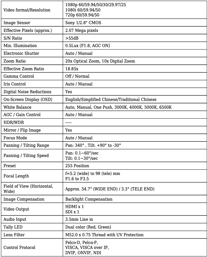 Agregue una cámara HD con capacidad de transmisión NDI a su entorno de transmisión, iglesia, empresa o educación con la cámara PTZ SDI/HDMI/NDI PTC-140NDI negra con zoom óptico de 20x de Datavideo. Esta versátil cámara PTZ admite velocidades de cuadro y resoluciones de hasta 1080p60 e incorpora un sensor CMOS de 1/2.8" con una resolución de 2.07 MP. El objetivo con zoom integrado ofrece un rango de zoom óptico de 20x, y puede ampliar aún más con el zoom digital de 10x. Admite salida de video HDMI, SDI y NDI|HX, compatible con cualquier red NDI estándar o plataforma de transmisión de video como YouTube, Skype, WebEx, Zoom y muchas otras.