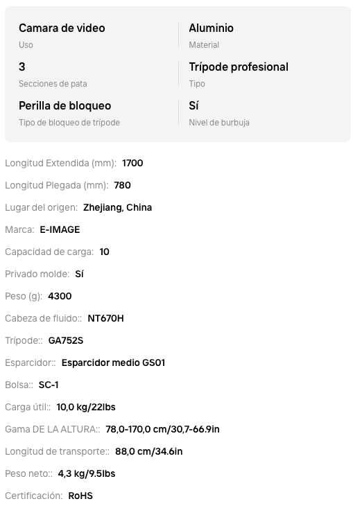 El último lanzamiento de E-Image, representa la próxima evolución en trípodes. Con características innovadoras, como un sistema de ajuste rápido, y una capacidad de carga mejorada de hasta 10 kg, con una altura mínima de 83,5 cm y máxima de 1,69 cm y apto para cabezales de 75 mm. Además, viene con una bolsa de transporte. El trípode profesional E-Image EI-720A Kit es ideal para fotógrafos y videógrafos que buscan calidad y fiabilidad. Con un elegante diseño en color negro, este trípode ofrece estabilidad y versatilidad para tus sesiones de fotos o grabaciones de video. El cabezal de vídeo y trípode de arrastre fluido E-Image EI-720A es un cabezal de vídeo y un sistema de patas de trípode de dos etapas diseñado para cámaras de vídeo y equipos que pesan hasta 10 kg.