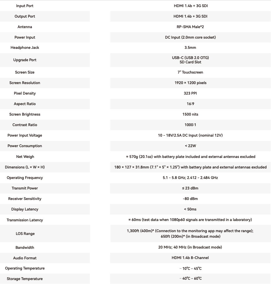 Pyro 7 es un monitor inalámbrico de 7 pulgadas que integra las funcionalidades de TX, RX y monitor, todo en uno. Utiliza la tecnología de salto de doble banda automático (ADH, por sus siglas en inglés). Con 400 m y una latencia increíblemente baja de solo 60 ms, Pyro 7 admite transmisión de doble banda 2,4 GHz/5 GHz y salto automático de frecuencia. Su excepcional diseño de hardware permite a Pyro 7 conectar simultáneamente un transmisor a cuatro receptores, y la comodidad de la monitorización de doble cámara se consigue mediante teclas de acceso directo personalizables. Además, el sistema HollyOS actualizado proporciona funciones mejoradas de análisis de imágenes y permite exportar archivos de vídeo a través de una tarjeta SD externa. Pyro 7 es compatible con Pyro H y Pyro S, lo que significa que puede emparejar fácilmente Pyro 7 con Pyro H o Pyro S. Esto le proporciona una mayor flexibilidad y escalabilidad para satisfacer diversas necesidades de monitorización.