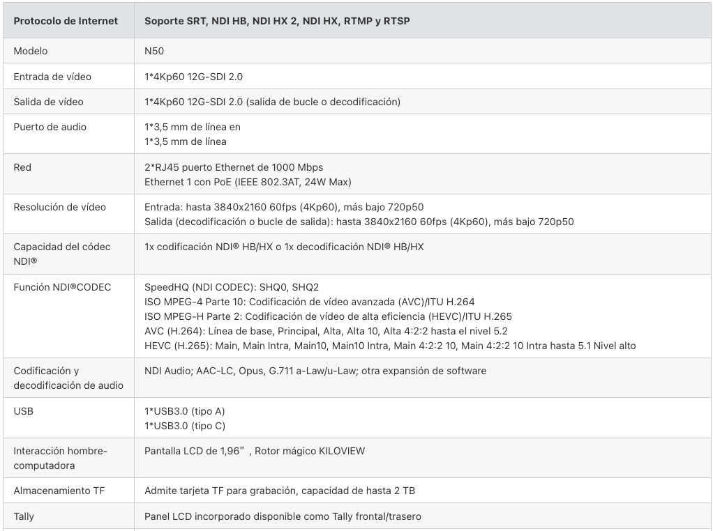 El N50 es compatible con NDI High Bandwidth y NDI HX, ofreciendo conversión bidireccional y SRT para una transmisión perfecta a través de LAN e Internet. Ofrece calidad de vídeo HDR de 10 bits 4:2:2 (bajo NDI HX) e incluye funciones como Tally, PoE, control PTZ, intercomunicador KIS Pro e incrustación de audio de 3,5 mm. El N50 está construido para cumplir con los más altos estándares de transmisión profesional de IP, asegurando un rendimiento excepcional. En el modo de codificación, el N50 convierte fácilmente una señal de vídeo 4K 12G-SDI en un flujo NDI y NDI|HX. Mientras esté en modo de decodificación, adaptará automáticamente el formato NDI y NDI|HX según sus necesidades finales. N50 maneja su transmisión NDI fácilmente con una baja latencia de menos de 80 ms.