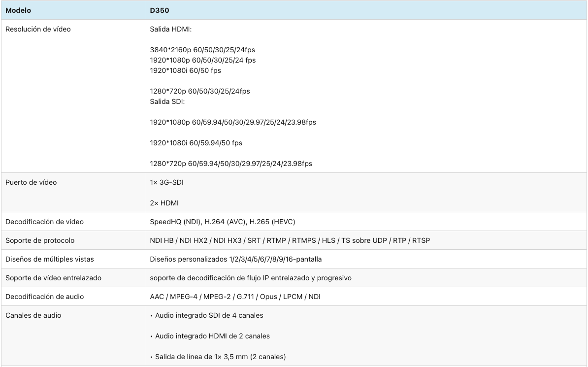 Diseñado para la decodificación de vídeo profesional, el decodificador de vídeo IP Kiloview D350 4K H.265/H.264 admite entrada y salida de vídeo UHD 4K60 y puede decodificar simultáneamente hasta 9 canales de vídeo IP 1080p60 o 16 canales de vídeo IP 1080p30. Cuenta con una salida 3G-SDI y dos salidas HDMI, admite múltiples formatos de audio y ofrece múltiples opciones de visualización. El D350 tiene una pantalla integrada para monitorización en tiempo real y admite NDI|HX2, NDI|HX3 (beta), NDI completo, SRT, RTMP, RTMPS, HLS, TS sobre UDP, RTP y RTSP para decodificar desde cualquier fuente de streaming.