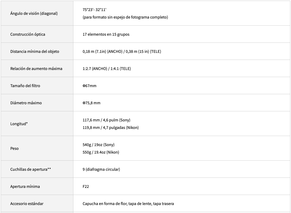 Con un diseño óptico actualizado y un sistema de enfoque perfeccionado, el Tamron 28-75 mm f/2.8 Di III VXD G2 es un zoom Sony con montura E que ofrece un rango versátil de gran angular a retrato y una brillante apertura máxima de f/2.8. La óptica renovada proporciona mayor resolución y nitidez que la generación anterior, y el sistema de enfoque se ha sustituido por un mecanismo VXD (Voice-coil eXtreme-torque Drive) que ofrece un rendimiento más rápido y preciso, ideal tanto para fotografía como para vídeo. Como segunda generación de este popular objetivo, esta versión actualizada también incluye mejoras en el diseño exterior, una distancia mínima de enfoque de 7.1" y un nuevo puerto de conexión para agilizar el uso del software Tamron Lens Utility y ajustar la configuración del objetivo.