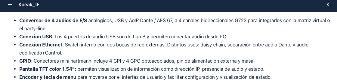 El interface Xpeak_IF interconecta bidireccionalmente el sistema Xpeak a 4 audios externos en formatos analógico, digital USB, o IP Dante/AES67. Es el complemento perfecto para trabajar con sistemas de cámaras o PA, intercoms RF, consolas de sonido, y otros. También añade al sistema 4 GPI y 4 GPO. 2 puertos IP, 4 USB tipo B, 4 XLR macho y 4 XLR hembra. Da entrada al sistema de intercom a 4 entradas de audio a elegir entre 4 puertos IP AES67/Dante, 4 puertos USB, y 4 puertos analógicos. Extrae simultáneamente 4 flujos de audio de intercom en cada uno de estos formatos. Además incorpora 4GPI y 4 GPO.